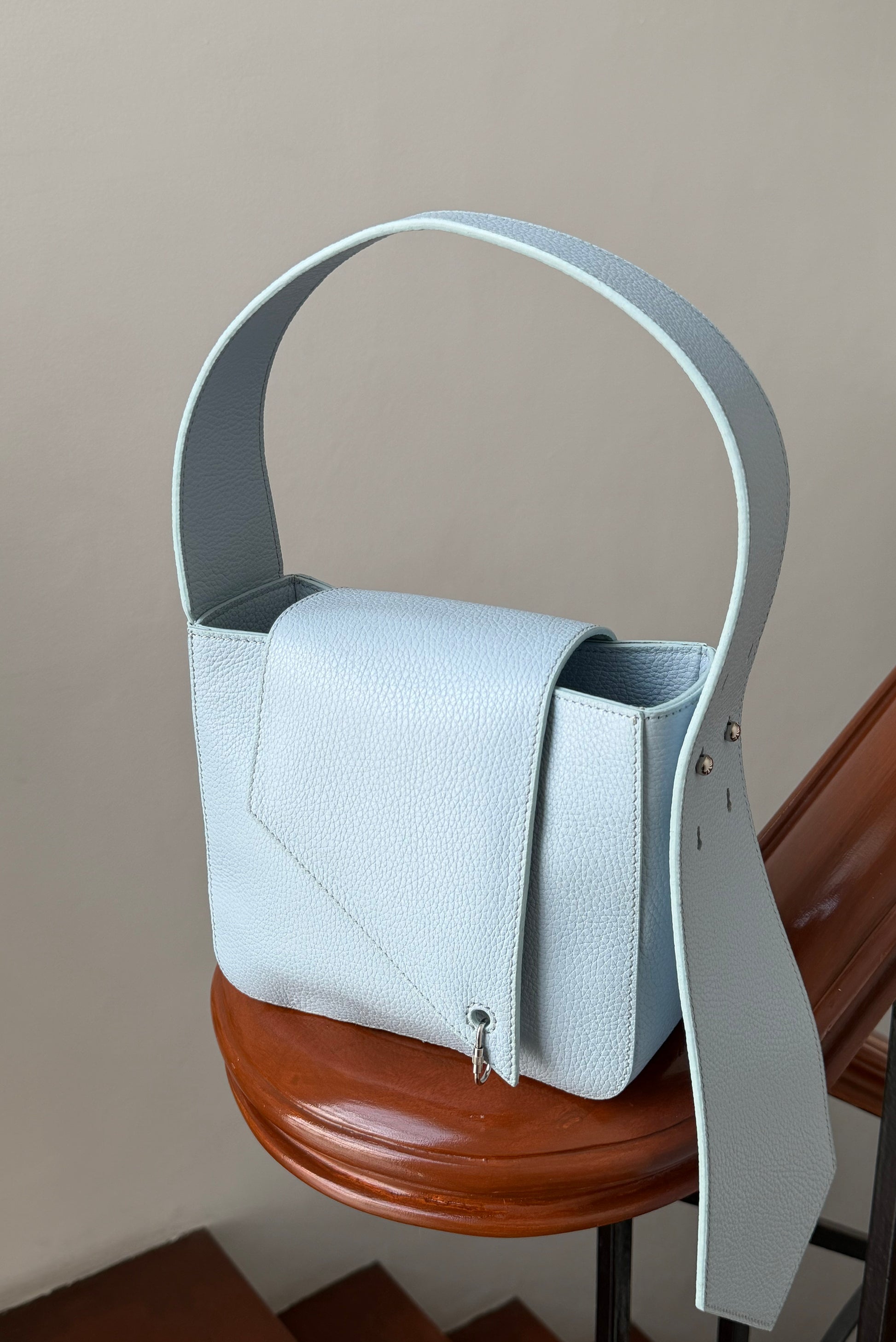 A full leather bag with a mini carabiner dangling at the end of its flap. The perfect mini that fits everything you need.